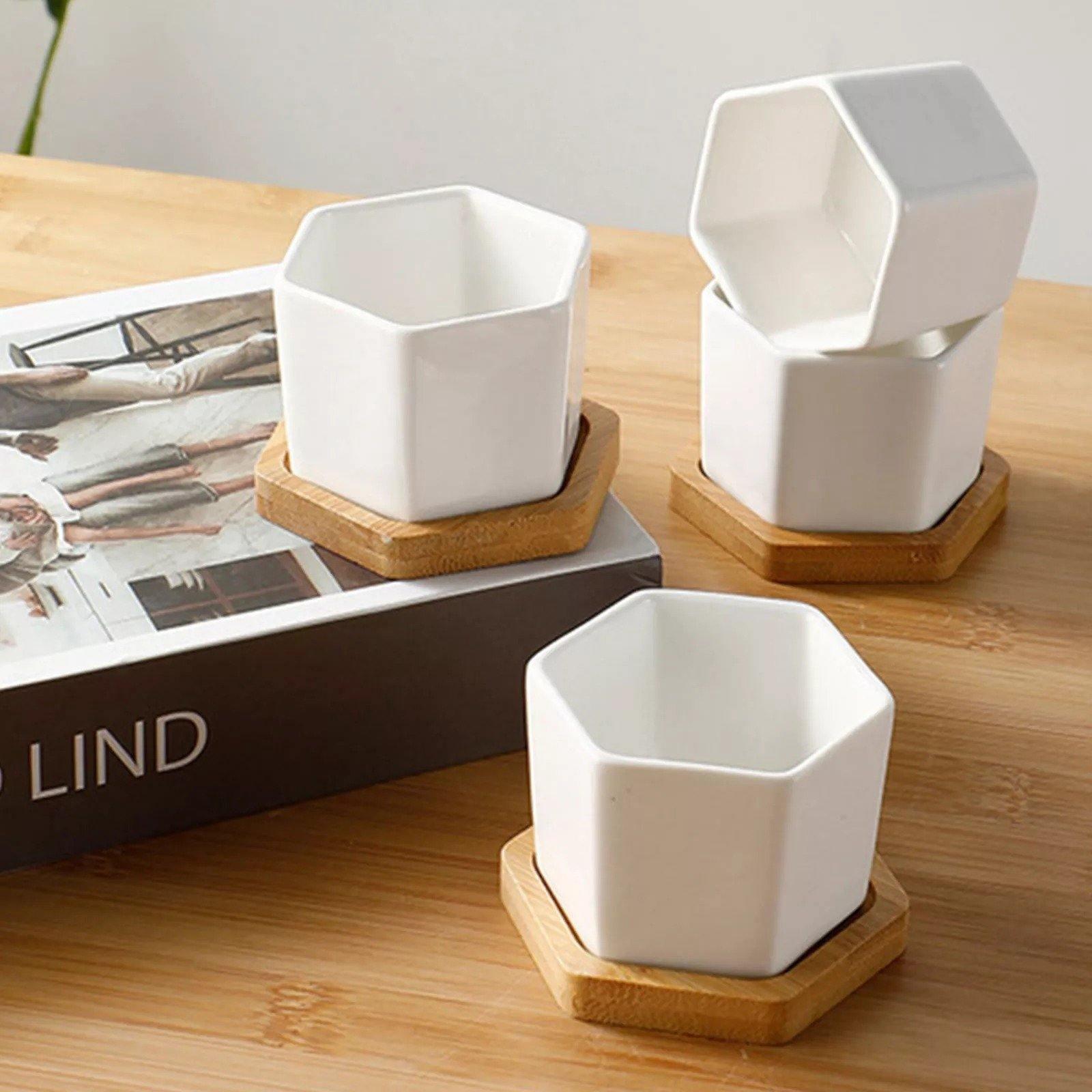 Hexagon Ceramic Succulent Planter with Bamboo Saucer